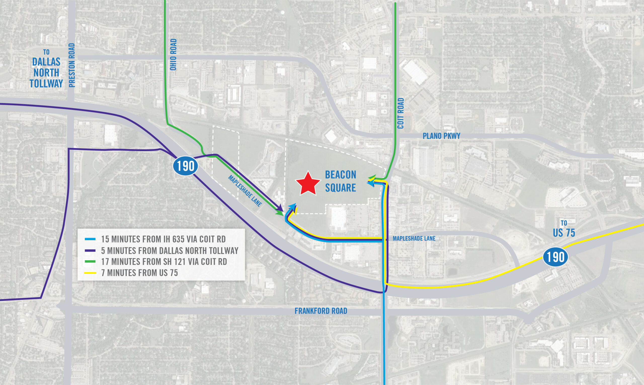 Beacon Square will be a state-of-the-art office campus in a dynamic mixed-use development at the corner of Beltline Road and I-635. Situated on George Bush Turnpike, it’s centrally positioned 15 minutes away from DFW Airport, Downtown, Frisco between the thriving Dallas and Fort Worth markets among a variety of corporate headquarters and a wealth of amenities.